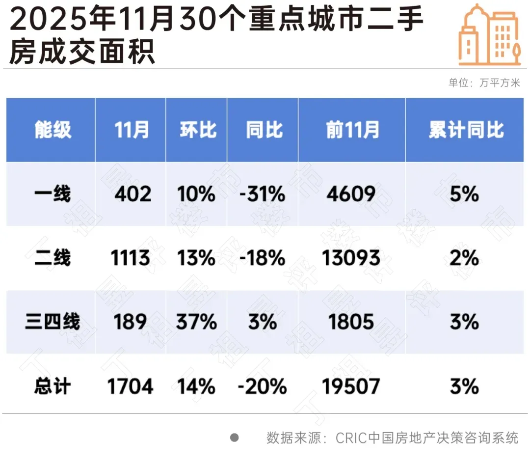 克而瑞地产研究数据显示,2025年前11月,其监测的30个重点城市二手房成交面积累计同比实现3%的正增长,其中一线城市表现尤为突出,前11月北京、上海二手房成交量分别同比增长2%、8%,深圳二手房成交量则同比增长超10%。