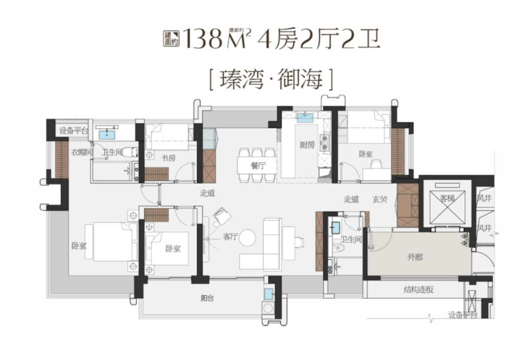 宝中核芯区的一线海景是难以复制的稀缺资源,项目最大化拉宽采光与观海面,超半数户型实现“头排海景舱”体验。其中建面约123㎡的四房,是含海量极高的低门槛海景户型,采用约17.8米超宽景观面设计,将前海湾壮阔海景、大铲岛轮廓与滨海文化公园绿意一并纳入室内。