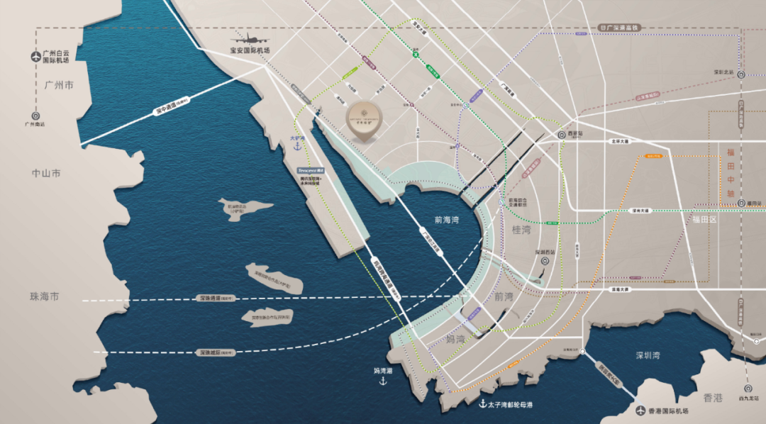 (宝安中心区西南向优越方位,直面约15公里黄金岸线,还是集“空港、海港、高铁、高速、快速、地铁”六维交通枢纽。)