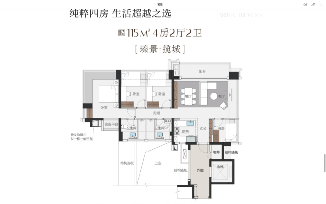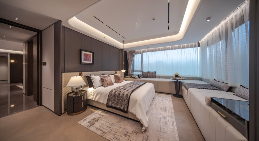 以建面约115㎡入门级四房为例,独立电梯厅带来约9.4㎡专属过渡空间,可打造玄关柜或展示区,实现“家的延伸”与入户尊崇感;主卧L形无柱飘窗摆脱传统立柱遮挡,超宽采光面让阳光洒满房间,夜晚倚窗可赏前海湾潮汐与企鹅岛灯火。